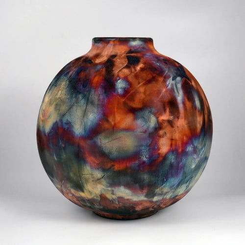 A mesmerizing sight to behold as soon as the rainbow-like patinas catch your eye. This Globe Vase is a round, capacious piece produced using the Raku technique, resulting in a beautiful unpredictable finish. This vase would be the perfect centerpiece or an addition to a growing collection of unique art in a home.
