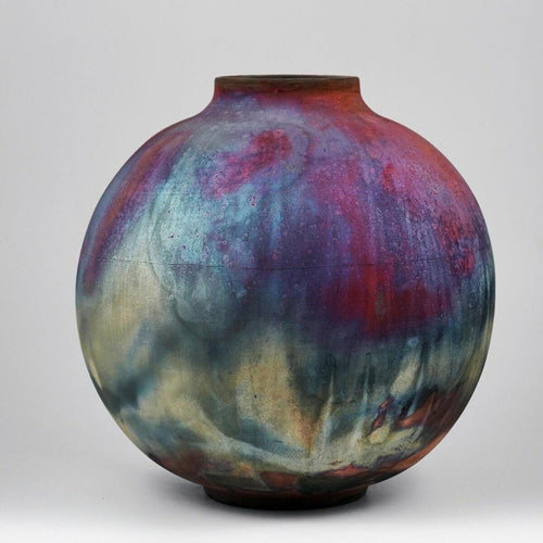 A mesmerizing sight to behold as soon as the rainbow-like patinas catch your eye. This Globe Vase is a round, capacious piece produced using the Raku technique, resulting in a beautiful unpredictable finish. This vase would be the perfect centerpiece or an addition to a growing collection of unique art in a home.