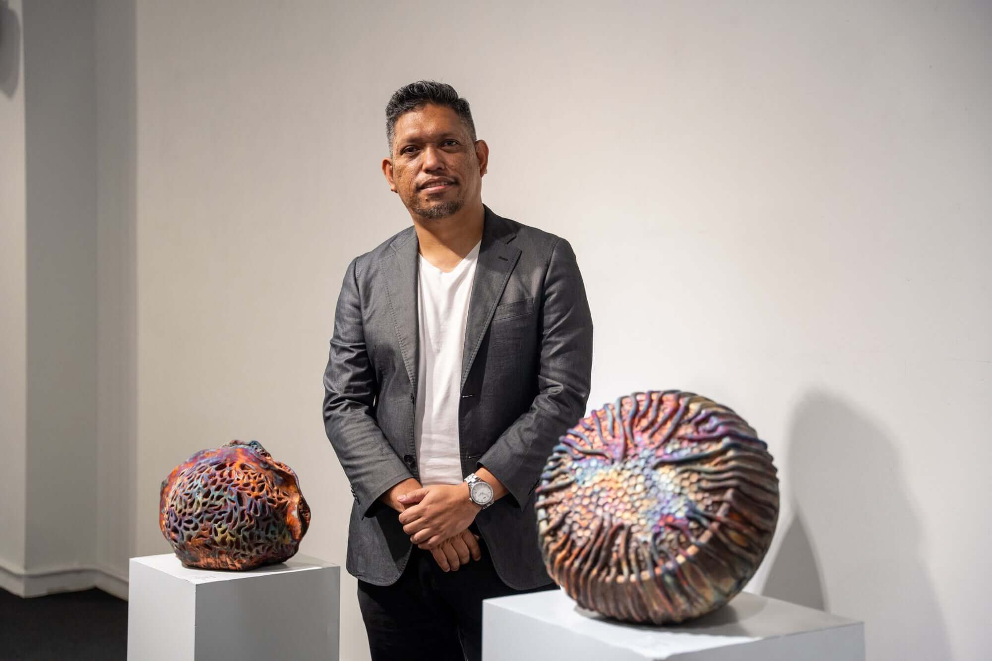 Harnessing the expressive raku technique, Adil Ghani imbues his sculptures with both fragility and strength. The glittered surfaces shimmer with symbolism — hope, healing, and the quiet resilience of the human spirit. Meanwhile, the signature crackle effect of raku becomes a narrative device, speaking to vulnerability as much as endurance, and revealing the complex, layered textures of personal experience.