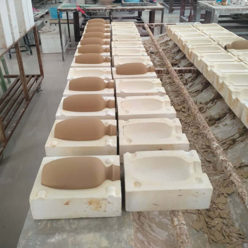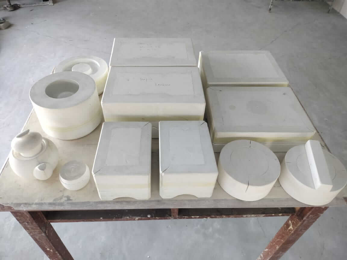 Using the case mould, artisans then produce production moulds—the actual moulds used for slip casting. These are made from high-quality plaster that can absorb water from the slip effectively. Depending on the shape of the object, the production mould may have two or more interlocking parts. Once poured and set, the mould is carefully opened and dried completely before use.